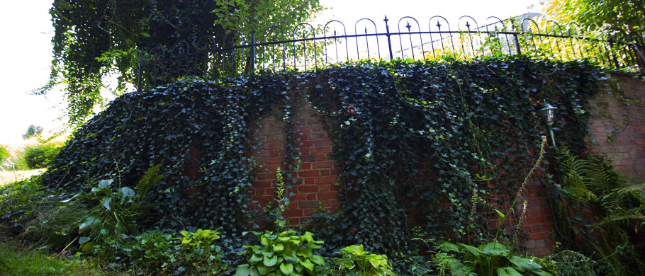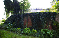 Curved 8' high brick retaining wall with rod iron fence above.