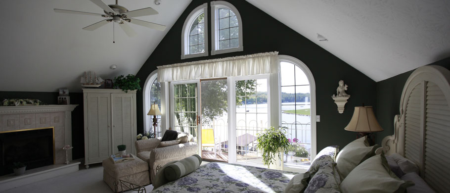 Sliding glass door walking out to deck, gas fireplace and quarter round windows