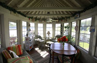 Octagon porch with open rafters.